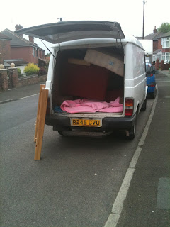 So while the 2 men were loading the LDV (I had to take pics, as they did not have professional transit blankets, but had a quilt, a duvet, and some bed sheets (I am not kidding) The sofa was just put in with no covers, with boxes stacked to pack it in. (photo)